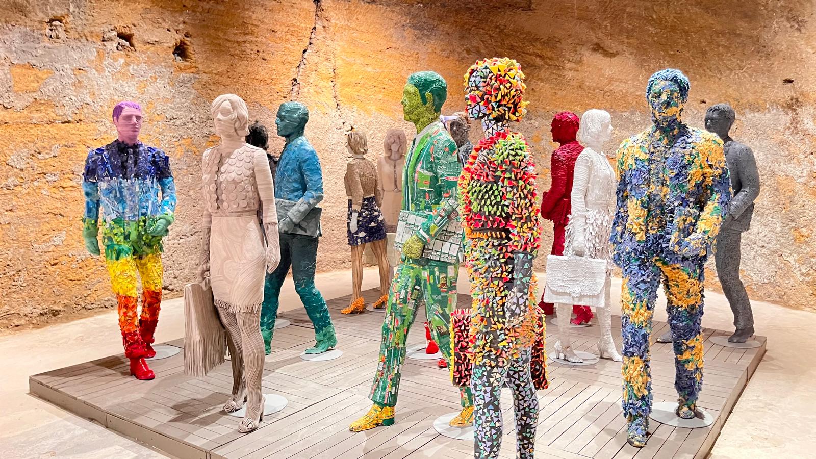 Lo fanno, Innanzitutto, le diciotto statue dinamiche di donne e uomini business, che animano il foyer del teatro e l’ex chiesa di Santa Sofia (adiacente all’ingresso del teatro stesso), sospese fra tensione professionale e desiderio di incontro. Ogni figura del collettivo (denominato Business Wo/men) è realizzata con un diverso materiale di scarto: ad esempio, filamenti di pelle, cinture di sicurezza, scatole di surgelati e persino componenti di PC. Tutto trasformato in silenzioso testimone di una nuova estetica della sostenibilità.