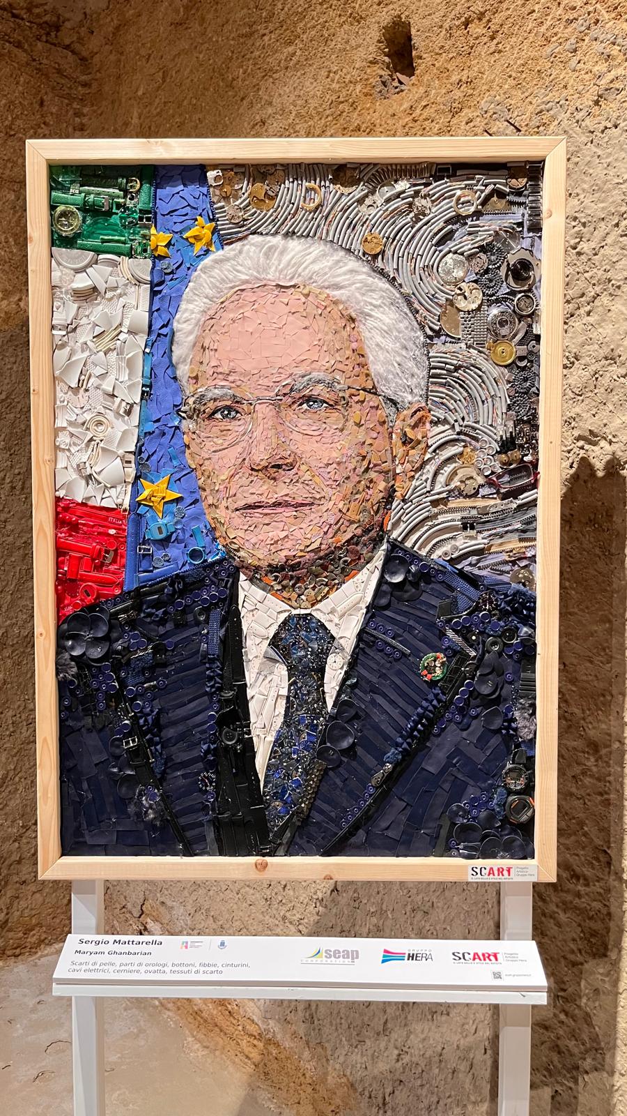 Pezzo pregiato della mostra è il ritratto del Presidente della Repubblica Sergio Mattarella, che questa mattina ha inaugurato ufficialmente Agrigento 2025. L’omaggio al Capo dello Stato, che gli sarà donato presso gli uffici del Quirinale, è realizzato con scarti compositi, fra cui ritagli in pelle, cavi elettrici, bottoni e numerosi orologi. L’effetto visivo richiama l’impressionismo. Da vicino, i materiali con cui è realizzato parlano ognuno per sé, facendo percepire allo sguardo solo i singoli elementi accostati. A mano a mano che ci si allontana, però, l’insieme restituisce un’espressione di incredibile nitidezza e profondità, in un gioco di colori e rimandi capace di emozionare.